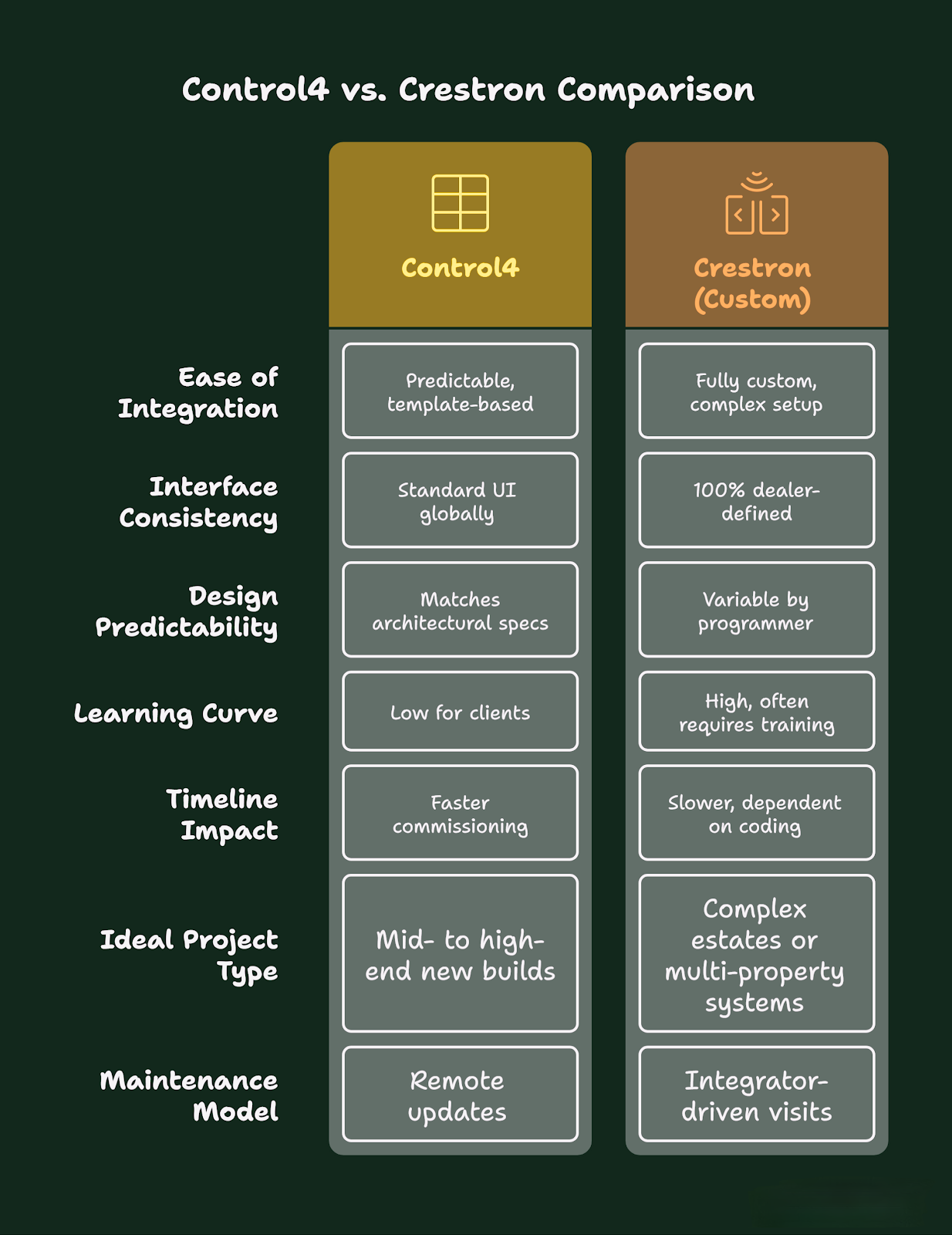 For architects and builders prioritizing predictable timelines and standardized design, Control4 is the superior choice. Crestron remains the leader for ultra-custom estates requiring bespoke features, but it introduces higher integration complexity and reliance on specialized programmers.