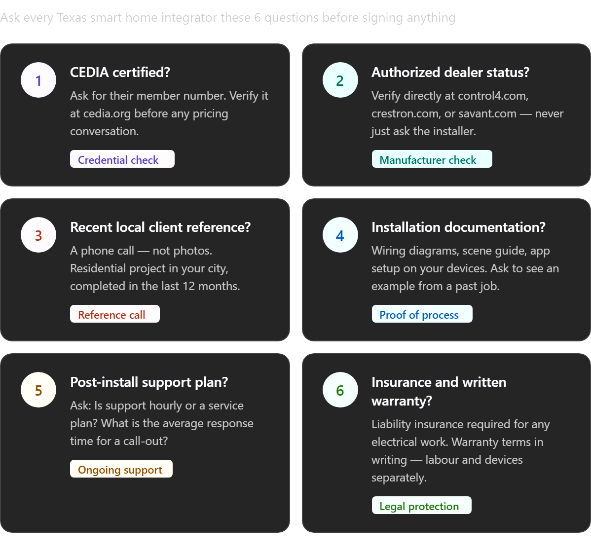 Ask six questions before signing with any Texas smart home integrator: CEDIA certification, authorised dealer status, a reference from a project in your city in the last 12 months, documentation examples, their post-installation support model, and proof of liability insurance with written warranty terms.