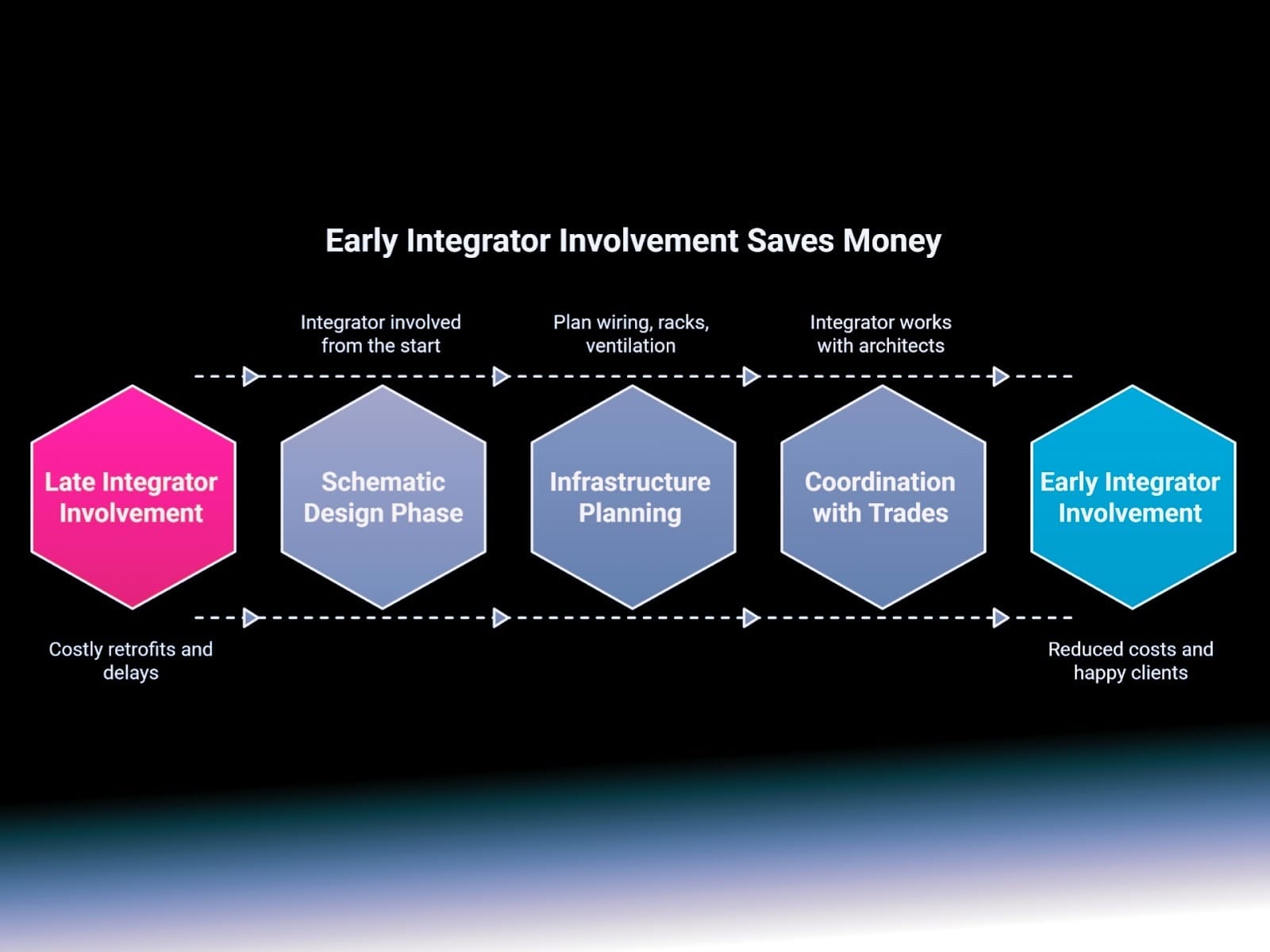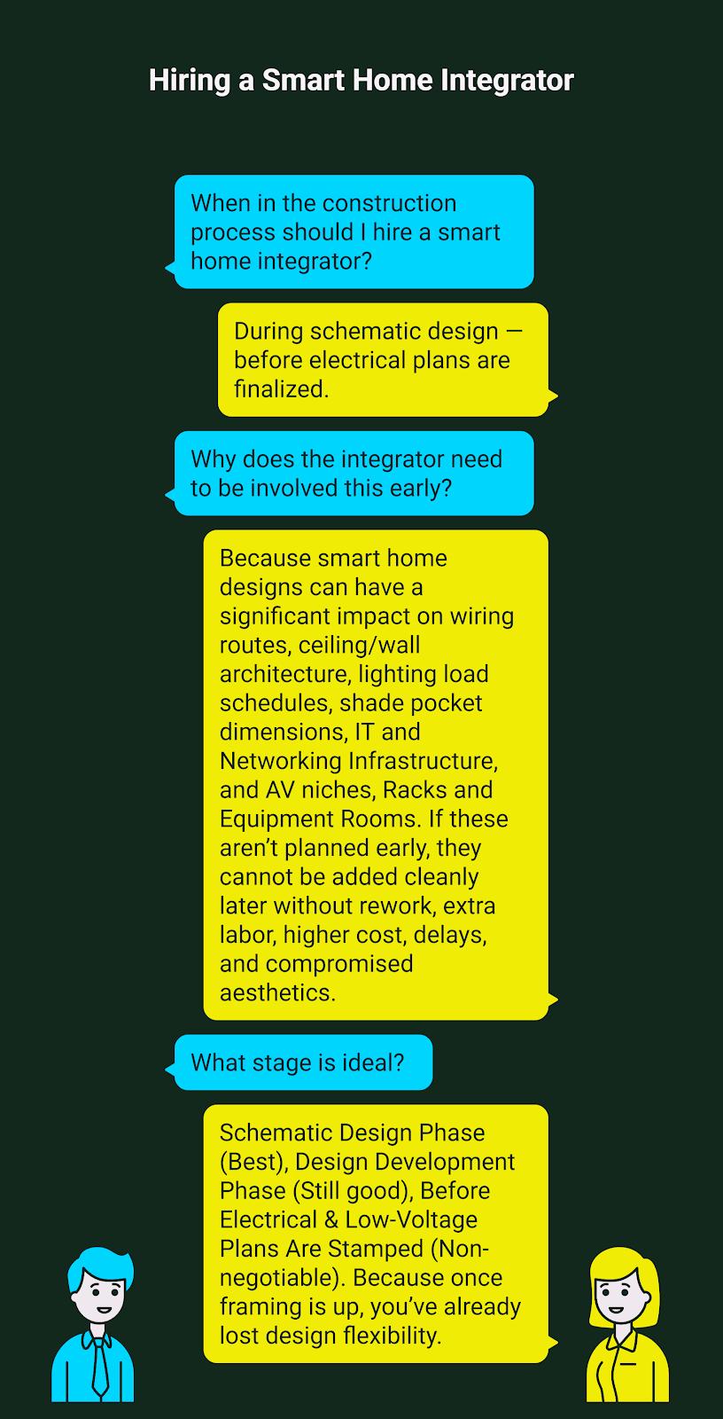 This matches what nearly every major integrator association (HTA, CEDIA) teaches: “Traditionally, smart home integrators come in after electrical work is done. That is often too late.”